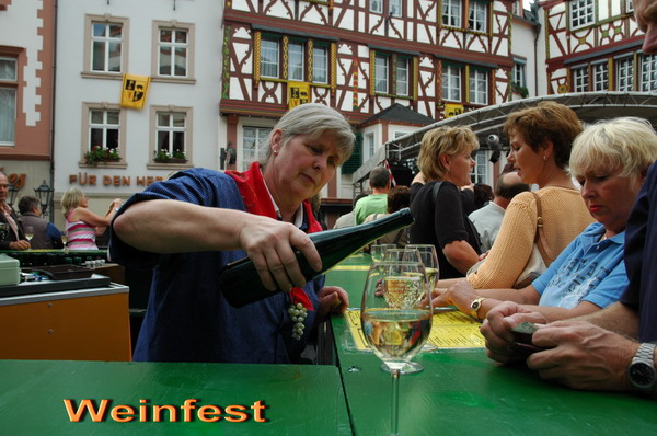 Fachwerkhäusern. Hier drängen sich heute die Menschen. Ein Weinstand schenkt Riesling zu fairen Preisen aus, eine Blaskapelle macht laute Musik.