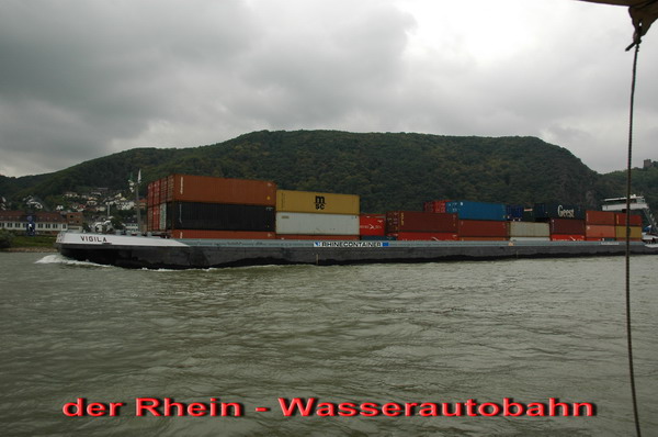 wir auf den Rhein. Der Himmel ist bleigrau, Windstärke 6 gegenan,